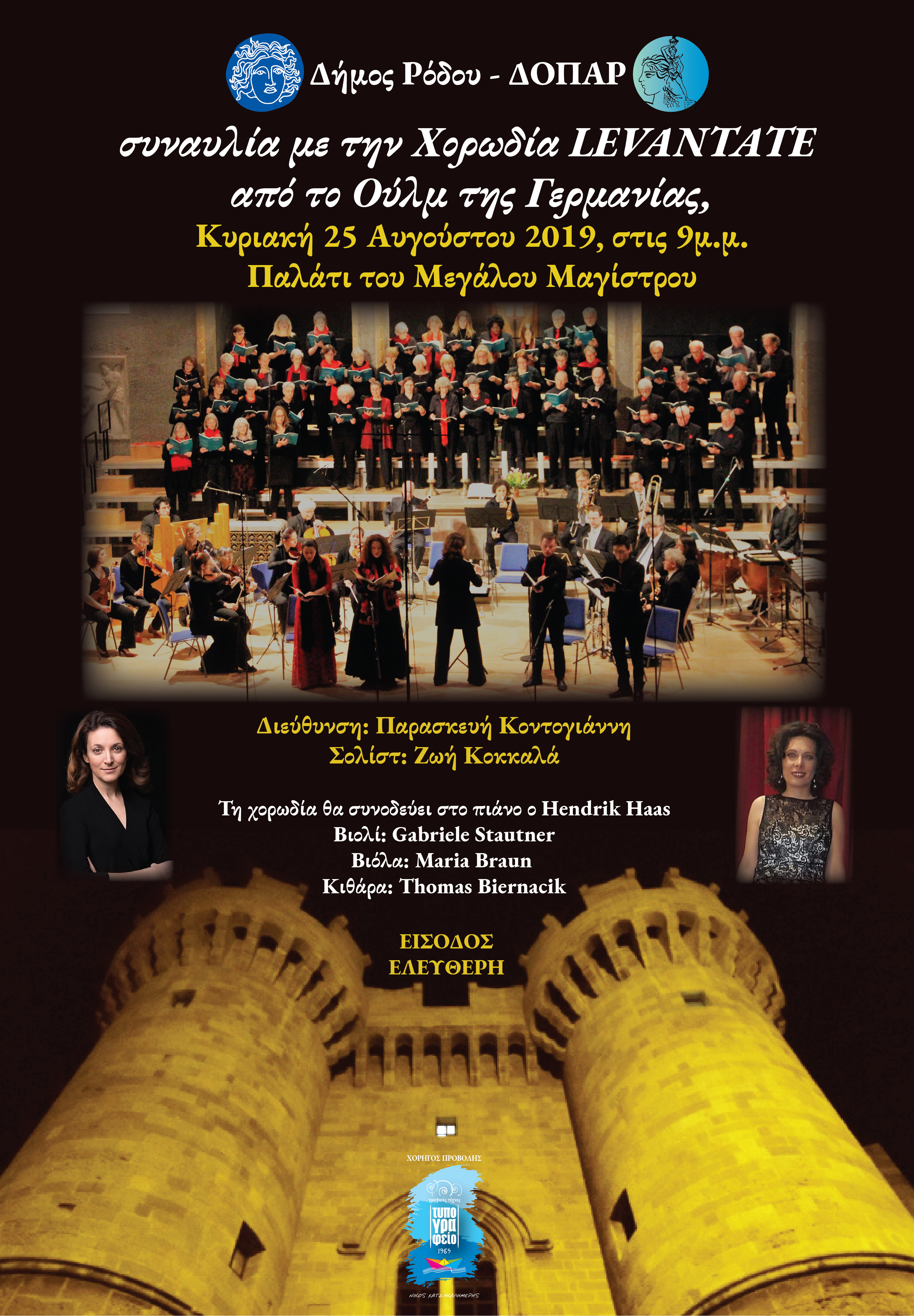 Ο Δήμος Ρόδου - ΔΟΠΑΡ διοργανώνει συναυλία με την Χορωδία ΛΕΒΑΝΤΑΤΕ  από το Ούλμ της Γερμανίας ,  την Κυριακή 25 Αυγούστου 2019, στις 9μ.μ. στο Παλάτι του Μεγάλου Μαγίστρου.
