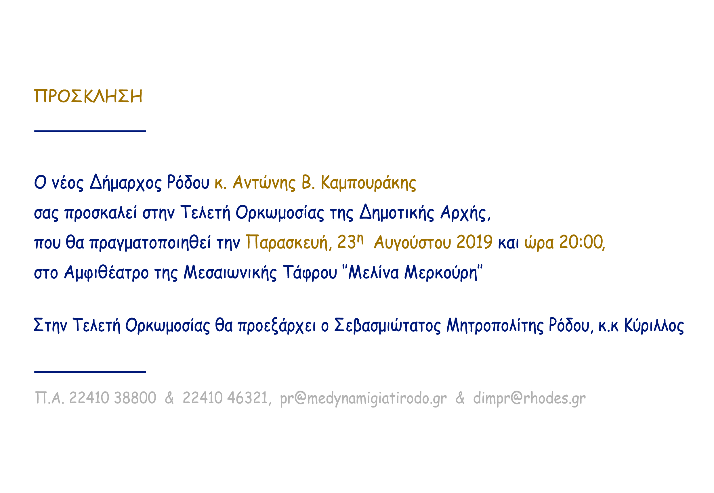 Η Ιερά Μητρόπολις Ρόδου και ο Θρησκευτικός Σύλλογος Γυναικών Λάρδου σας προσκαλούν εις την εκδήλωσιν προς τιμήν του Σεβ. Μητροπολίτου Γάνου και Χώρας κ. Αμφιλοχίου, η οποία θα πραγματοποιηθή εις τον Καθεδρικόν Ιερόν Ναόν Ευαγγελισμού της Θεοτόκου πόλεως Ρόδου την Κυριακήν 28ην Ιουλίου 2019 και ώραν 20.00.