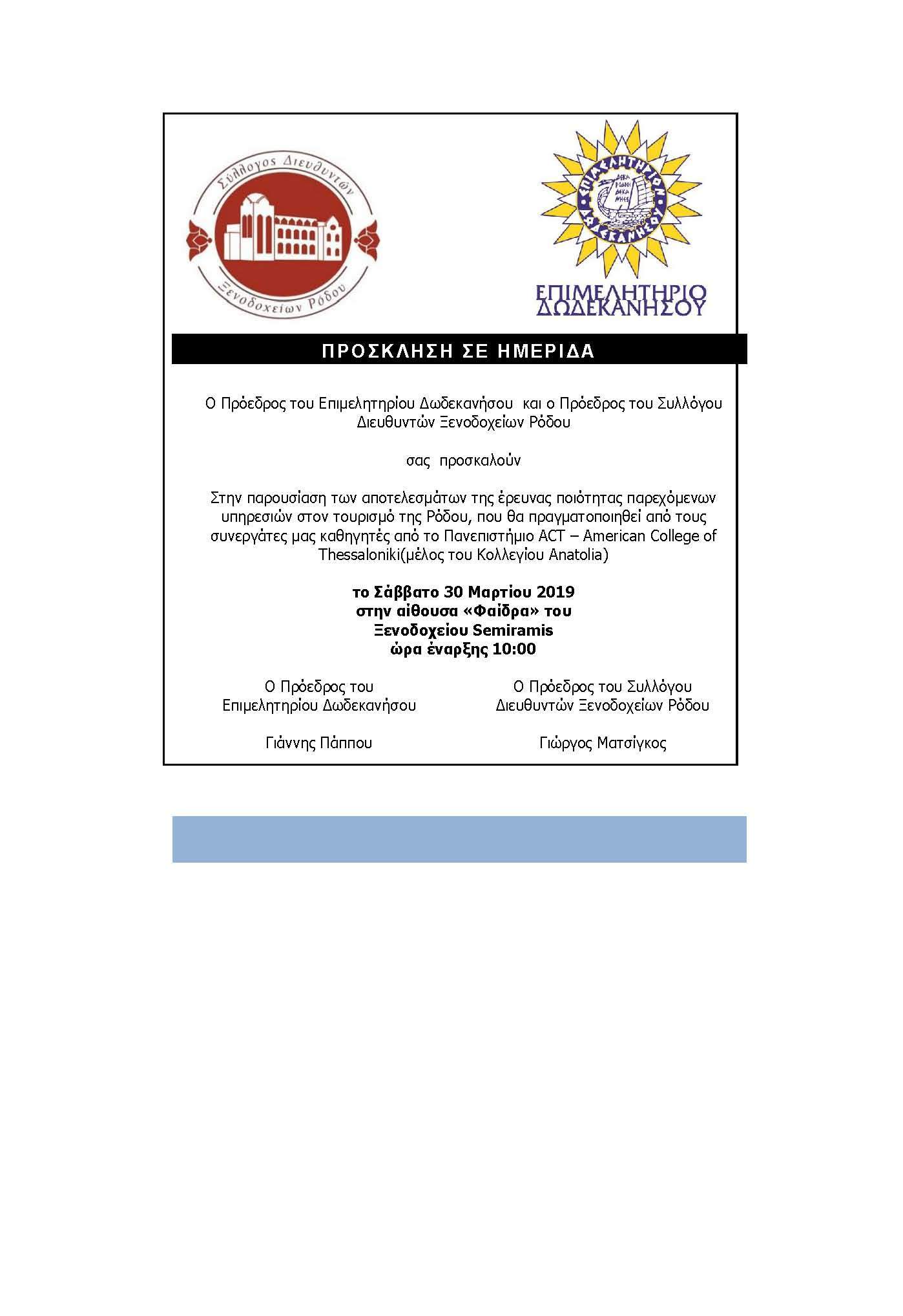 Στην παρουσίαση των αποτελεσμάτων της έρευνας ποιότητας παρεχόμενων υπηρεσιών στον τουρισμό της Ρόδου, που θα πραγματοποιηθεί από τους συνεργάτες μας καθηγητές από το Πανεπιστήμιο ΑCT – AmericanCollegeofThessaloniki(μέλος του Κολλεγίου Anatolia)