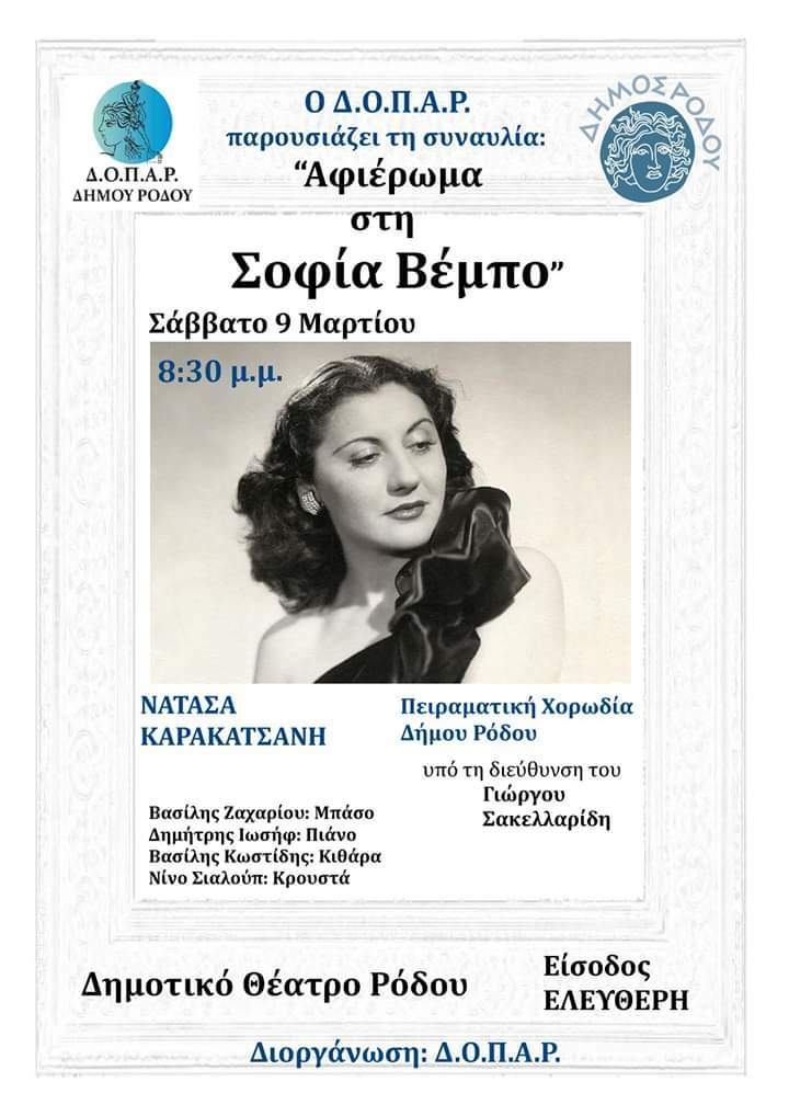Ο Δήμος Ρόδου - ΔΟΠΑΡ  παρουσιάζει την μουσική παράσταση "Αφιέρωμα στη Σοφία Βέμπο" το Σάββατο 9 Μαρτίου 2019 στις  8:30 μμ στο Δημοτικό Θέατρο Ρόδου.