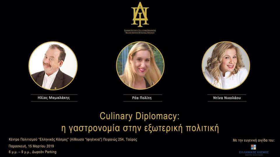Το Ελληνικό Ινστιτούτο Πολιτιστικής Διπλωματίας υπό την αιγίδα του Ελληνικού Κόσμου διοργανώνει συζήτηση με τους chef κ. Ηλία Μαμαλάκη και κα. Ντίνα Νικολάου υπό τον τίτλο ''Culinary Diplomacy: η γαστρονομία στην εξωτερική πολιτική''.