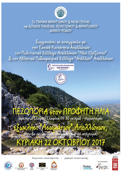 Το Τμήμα Αθλητισμού & Νέας Γενιάς, της Δ/νσης Παιδείας, Πολιτισμού & Αθλητισμού Δήμου Ρόδου, σας ενημερώνει ότι την πεζοπορία της Κυριακής 22ας       Οκτωβρίου 2017, στον Προφήτη Ηλία, υποστηρίζεται και από την Εφορεία Αρχαιοτήτων Δωδεκανήσου μετά από έγκριση του σχετικού αιτήματος από την αρμόδια Υπηρεσία.